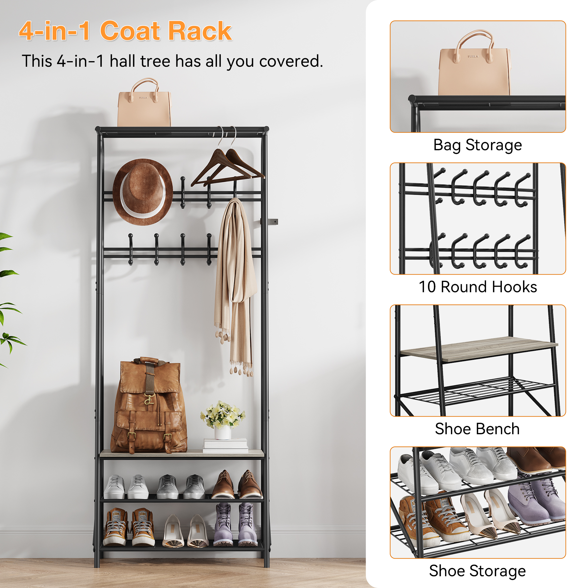 Garvee Banco Zapatero con Perchero 4 en 1 Metal y MDF 8 Ganchos Dobles 60cm Ancho Estante Superior Fácil Montaje Color Gris