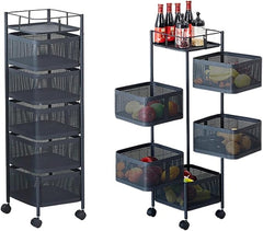 - Uso Eficiente del Espacio: El diseño de múltiples capas de este carrito de cocina maximiza su espacio de almacenamiento con un mínimo espacio requerido. Cesta giratoria para frutas, el diseño de malla hueca de las cestas permite la circulación del aire, previniendo la acumulación de humedad y manteniendo las frutas y verduras frescas por más tiempo.