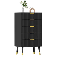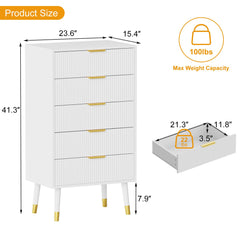Garvee Cómoda Alta De 5 Cajones Fluted Con Tiradores Dorados Para Dormitorio Y Sala, MDF Resistente, Minimalista, Antivuelco, Blanco
