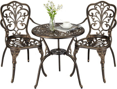 Garvee Conjunto Bistro Exterior 3 Piezas de Aluminio Fundido, Mesa con Agujero para Sombrilla, Muebles para Balcón y Jardín, Bronce