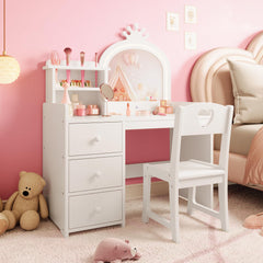 - Almacenamiento Espacioso y Práctico: Mantén los accesorios ordenados con tres cajones, estantes abiertos, soportes para cepillos y una amplia superficie de mesa, proporcionando espacio suficiente para joyas, accesorios para el cabello o material de papelería. Perfecto para un tiempo de juego organizado o rutinas diarias.