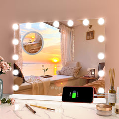 - Espejo profesional estilo Hollywood con 15 luces LED: El espejo de maquillaje iluminado (58x46cm) ofrece 15 lámparas LED de alta calidad para una iluminación perfecta. Con 3 temperaturas de color (cálido/neutro/frío) y brillo regulable, ideal para un maquillaje preciso a cualquier hora del día. Incluye conexión USB-C y USB para cargar tus dispositivos.