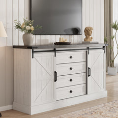 - [4-Drawers TV Stand] Este centro de entretenimiento blanco para dormitorio mide 58.7 pulgadas de ancho x 15.7 pulgadas de profundidad x 31.8 pulgadas de alto. Los 4 cajones miden 24.4 pulgadas de ancho x 12.5 pulgadas de profundidad x 5 pulgadas de alto, con una capacidad máxima de carga de 50 libras, proporcionándote el espacio de almacenamiento perfecto para ropa de cama, accesorios, ropa fuera de temporada y más.
