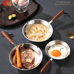 - Sartén pequeña de acero inoxidable de alta calidad, resistente a la corrosión y al óxido, con un mango ergonómico de madera resistente al calor para mayor seguridad y comodidad.