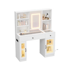 - Diseño de lujo y organización del tocador con espejo y luz: Elegante superficie de vidrio de alta calidad que muestra tu colección de cosméticos con estilo. Combinado con cajones profundos, estantes y vitrinas de vidrio con iluminación LED en colores arcoíris para un almacenamiento ordenado.
