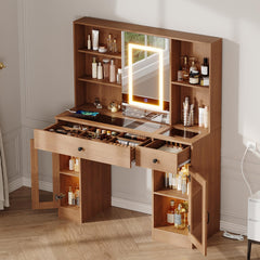 - Alimentación integrada del tocador con espejo y luz: Prácticos enchufes AC/USB directamente en la mesa para usar secadores de pelo, planchas o cargar dispositivos durante el peinado.