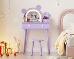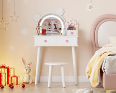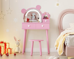 Garvee Set de Tocador Infantil con Luces LED y Forma de Oso, Escritorio y Taburete de Madera para Niñas, Diseño Seguro, Almacenaje Amplio, Color Natural