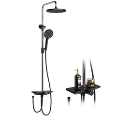 3 modos de chorro con un botón: lluvia, masaje suave e intenso. Selector rápido entre cabezal superior, ducha de mano y salida inferior con estante integrado.