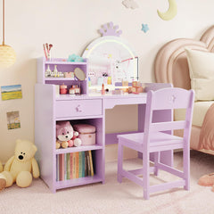 - Amplio almacenamiento para todos sus esenciales: Con cuatro estantes abiertos, una mesa espaciosa y un cajón conveniente, este tocador de maquillaje de madera para niños mantiene las herramientas de maquillaje, joyas, juguetes y libros ordenados y siempre al alcance de las niñas