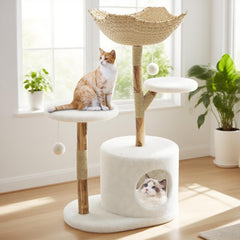 - PIEZA ARTÍSTICA ESTÉTICA PARA EL HOGAR: Plataformas redondas y cesta tejida a mano crean un árbol para gatos con una estética única. El acabado blanco minimalista se integra con la decoración moderna y funciona también como una escultura artística funcional en salas de estar.