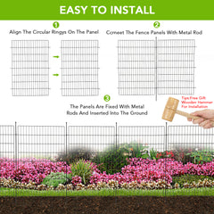 - Diseño flexible: Esta cerca de jardín conecta paneles usando postes metálicos, con cada panel midiendo 29 pulgadas de ancho. Puede personalizar la forma de la instalación según sus necesidades y también puede comprar paneles adicionales para extenderla.