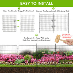 - Fácil instalación sin cavar: Nuestra cerca de jardín sin necesidad de cavar está diseñada para una configuración sencilla. Simplemente alinee los anillos de las dos secciones de la cerca, conéctelas con postes metálicos e inserte los postes en el suelo. No se requiere un proceso de instalación complicado ni herramientas especiales para crear una cerca atractiva para exteriores.