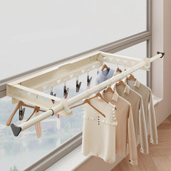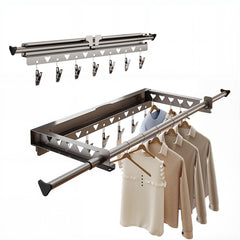 - Diseño de barra transversal retráctil: La barra transversal de este tendedero montado en la pared es retráctil según sus necesidades. En comparación con otros tendederos, con nuestra barra transversal también puede secar objetos más grandes como edredones y mantas. Siete clips metálicos adicionales le ayudan eficazmente a secar ropa interior, calcetines y otros objetos pequeños, aumentando así la versatilidad del tendedero para satisfacer las necesidades de su familia.